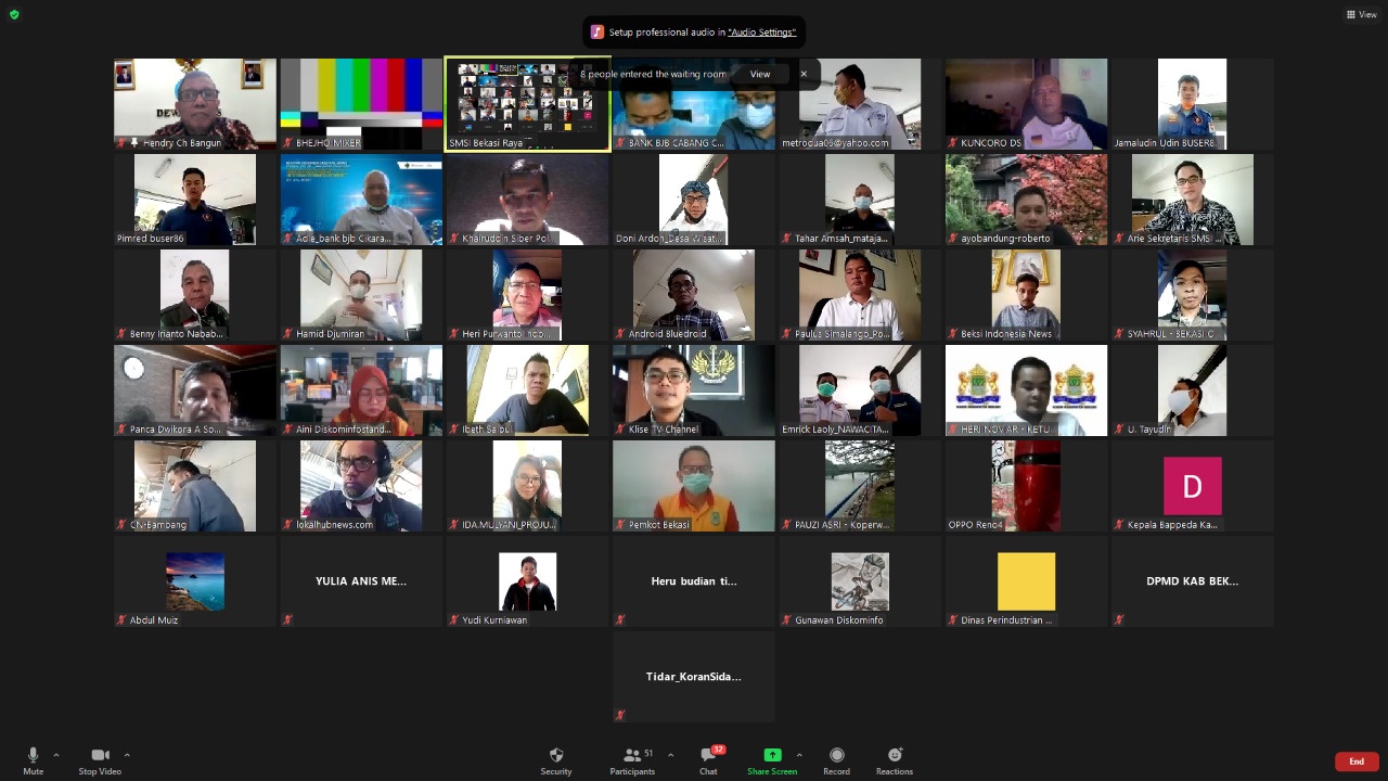 Turut hadir melalui video conference, anggota KADIN Indonesia Komite Malaysia Ny. Arie Rahmadani, Kepala BJB Cabang Kabupaten Bekasi Adi Arif Wibawa, Kepala BPBD Kabupaten Bekasi dan Kepala BPBD Kota Bekasi, Dinas Kominfo, Dinas Perindustrian, Dinas Perdagangan, Dinas Kesehatan, Dinas Pemberdayaan Masyarakat Desa, pengelola Kawasan Industri Kota Delta Mas, Hyundai, Jababeka, perwakilan perusahaan industri, pengusaha media, ketua PWI Bekasi Raya, Melodi Sinaga dan manajer kerjasama Badan Usaha Milik Desa (Bumdesa) Hegarmukti, Reyhan selaku moderator dalam Webinar Dialog Media.