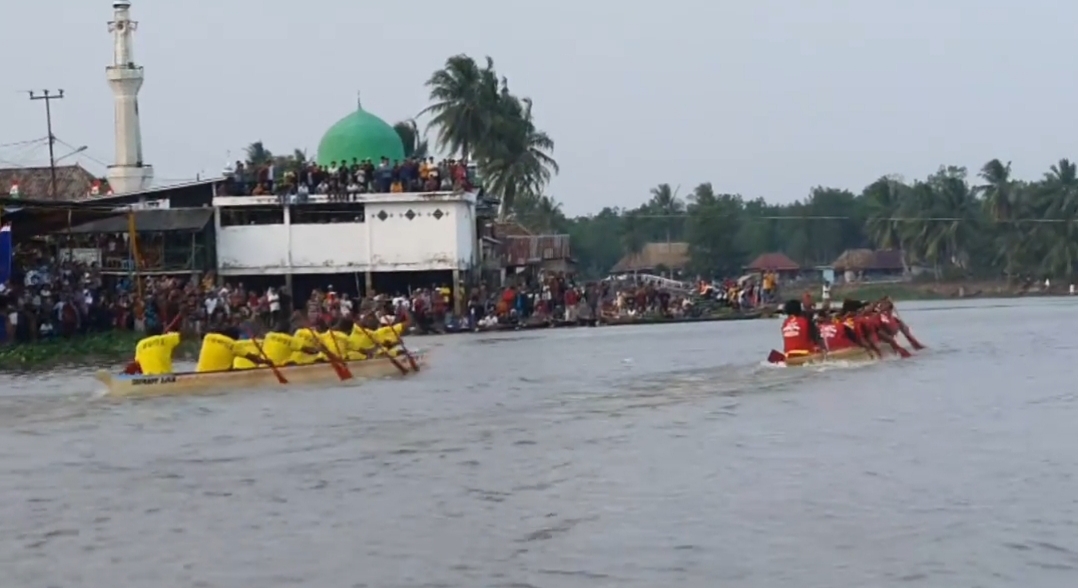 PEDAMARAN, ||Pelita Online|| Ribuan masyarakat Desa Pedamaran Kecamatan Pesamaran memadati sepanjang alur sungai Babatan, mulai dari Pedamaran 1 sampai ke Desa Tanjungnior. Mereka datang untuk menyaksikan lomba perahu bidar yang sempat vakum selama 2 tahun karena pandemi COVID-19.