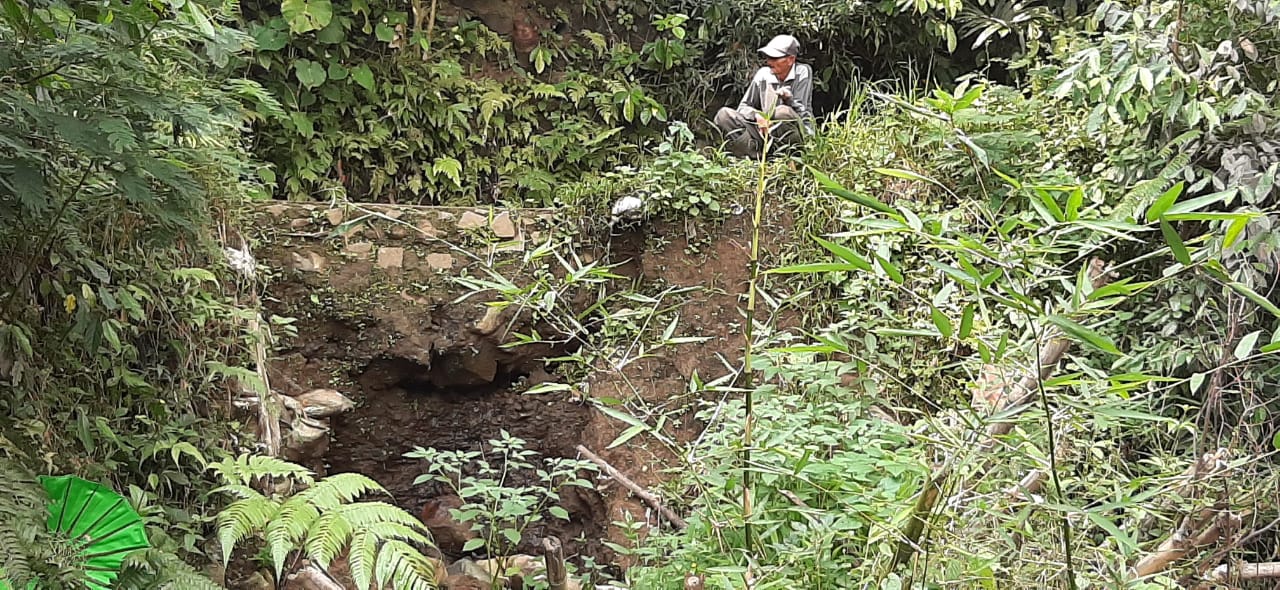 Terlebih, air yang melintasi tebing yang mengalami penurunan tanah tersebut sudah mulai meresap dan turun melalui celah-celah batu pondasi yang masih melekat pada tembok penahan air tersebut, papar H. Jaja sembari menunjuk ke arah bagian bawah pondasi.